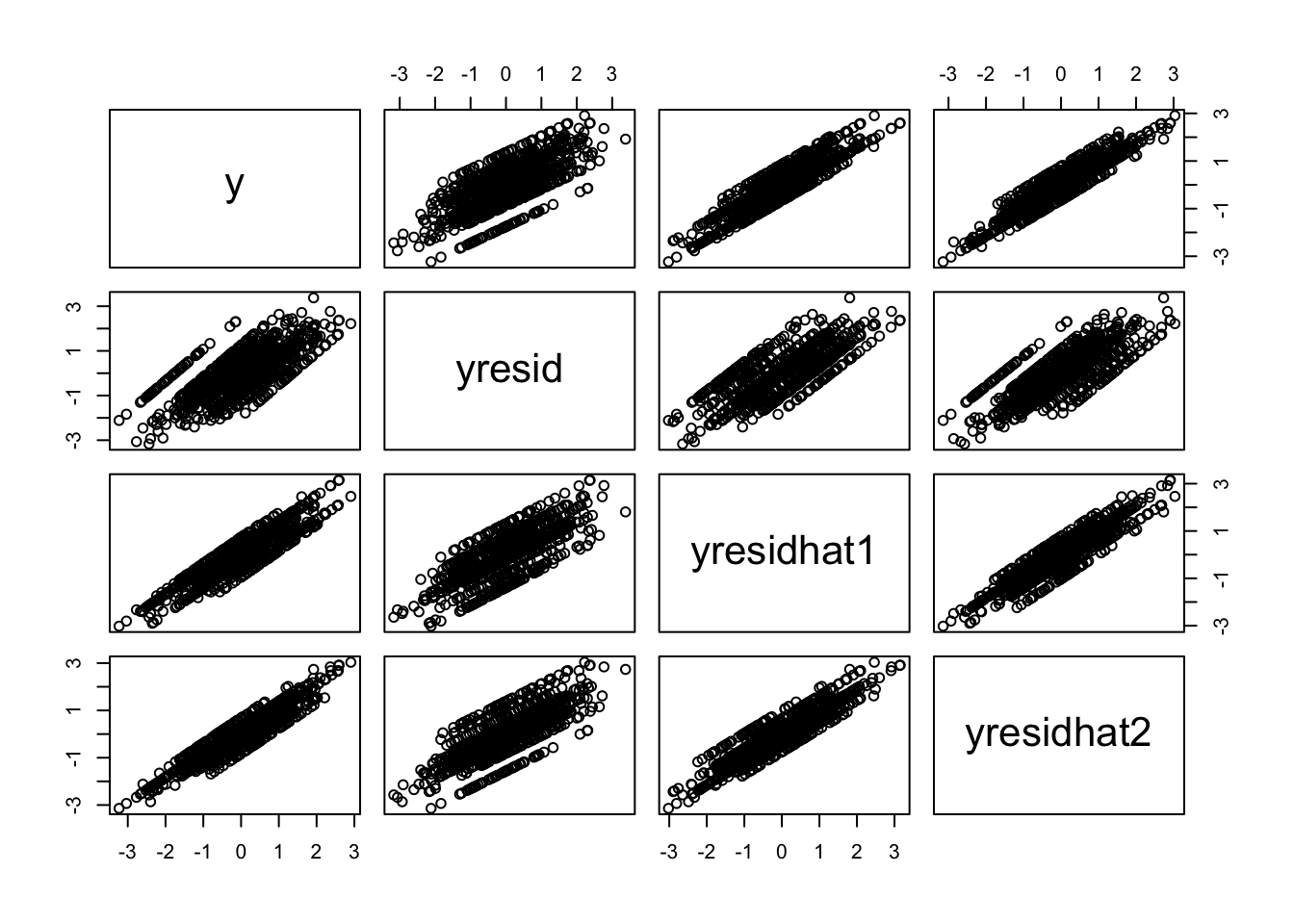 pairs (cbind (y, yresid, yresidhat1, yresidhat2))